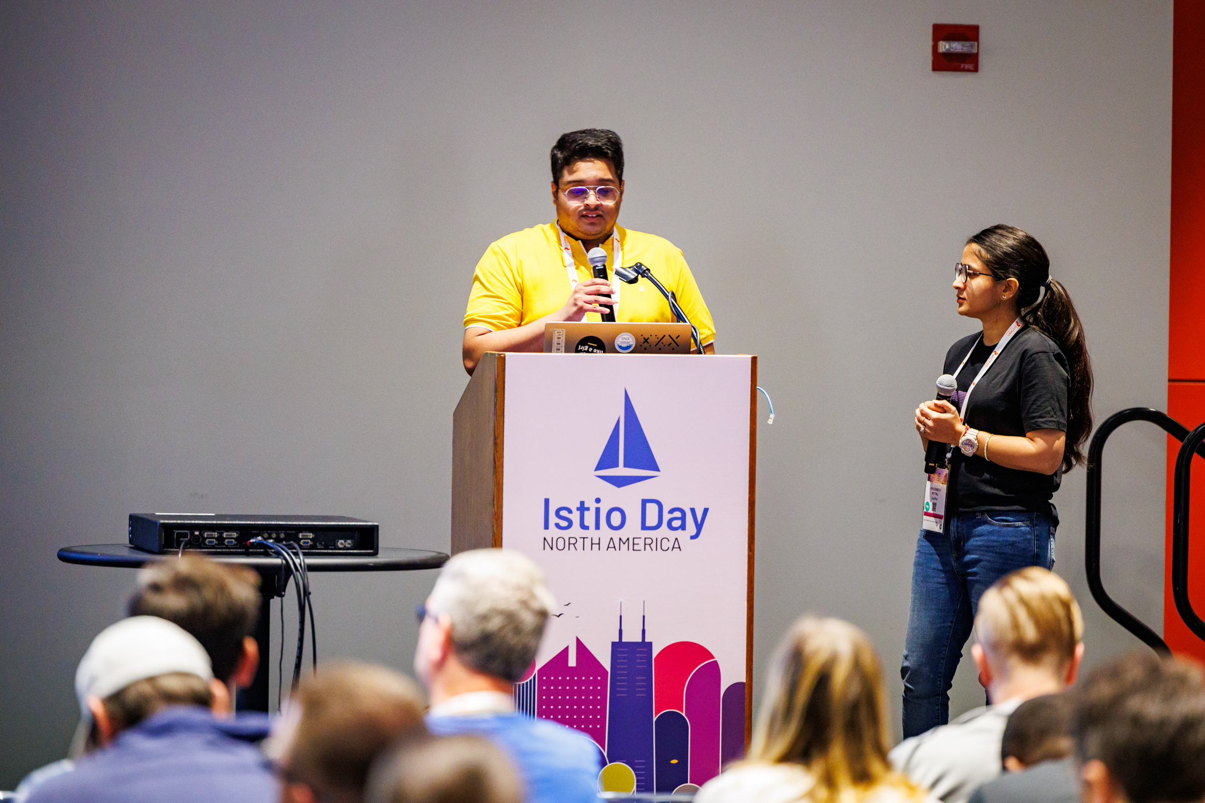 La keynote fue seguida por una charla de usuario final de Kush Trivedi y Khushboo Mittal de DevRev sobre su uso de Istio. Tuvimos una sesión muy esperada sobre arquitectura de ambient para escala de John Howard, que generó algunas discusiones interesantes en la comunidad. También tuvimos una charla interesante mostrando la colaboración entre Lilt e Intel sobre Escalado de servicios de traducción impulsados por IA usando Istio.